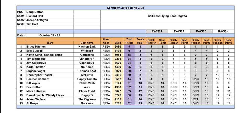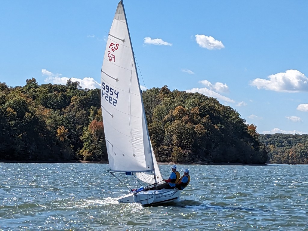 The Sail Fest Regatta October 21 & 22, 2023, at Kentucky Lake was fantastic. This was our 6th regatta and, just barely, our first two-day regatta. All other regattas were cancelled on one of the days due to lack of wind. And when I say “barely”, we almost did not get in one race for the second day, and race 5 was called off.
