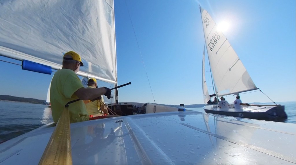 We got an early start Day 2 to ensure we could get 3 races in. Although winds were extremely light, we left the harbor before 8 AM. Our friends on Kentucky Lady (Montague) decided to sail out of the harbor on jib alone, and raise their main out in the main lake. Something stuck at the top of the mast, and they called for help on the radio to minimize the time to repair. Gadzooks! to the rescue! We sailed over, pulled Kentucky Lady over on top of our boom, and realized the shieve at the top of the mast had fractured, preventing the halyard from raising the main. We hand-raised the main, locked the halyard in, and pushed the boat upright. Here’s a short of us completing the maneuver. The RC took the snapshot a the top of this post for us.